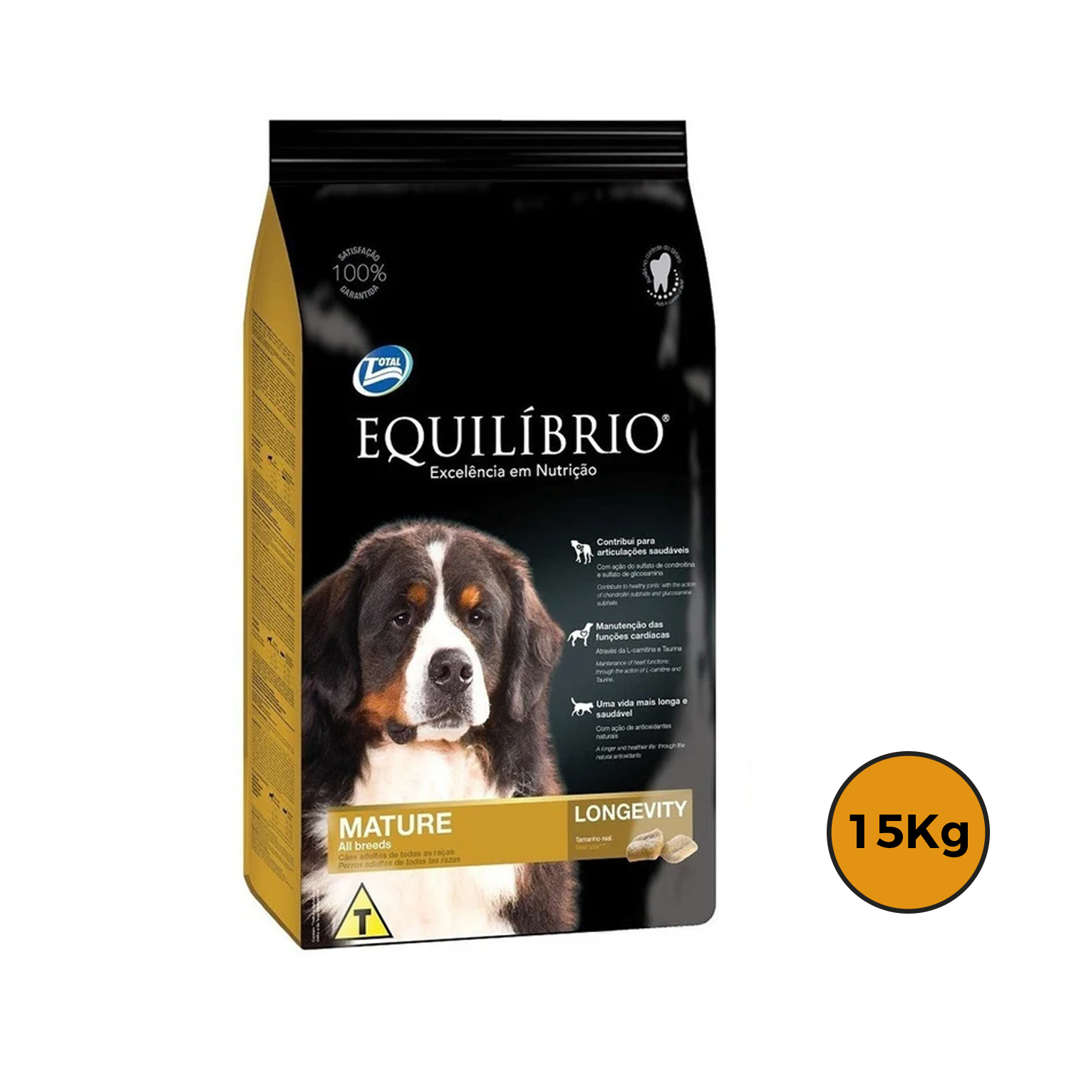 EQUILIBRIO MATURE 15 KG ANALISIS NUTRICIONAL Humedad (Máx.) 10%, Proteína Bruta (Mín.) 26%, Grasas (Mín.) 13%, Fibras (Máx.) 3,5%, Materia Mineral (Máx.) 7,5%, Calcio (Máx.) 1,3%, Fósforo (Mín.) 0,75%, Taurina (Mín.) 0,1%, L-carnitina (Mín.) 0,02%. COMPOSICION BASICA: Carne mecánicamente separada de pollo, Harina de menudos de pollo, Harina de Pescado, Arroz medio grano, Maíz integral molido**, Sorgo integral molido, Afrecho de gluten de maíz 60**, Proteína hidrolizada de soja*, Levadura seca de caña de azúcar, Grasa de pollo (preservada con tocoferol y esencia de romero), Aceite de pescado refinado, Semilla de linaza, Aceite de soja desgomado*, Probiótico, Pulpa de remolacha, Inulina, Manano-oligosacáridos, propionato de calcio, Cloruro de Colina, Fosfato dicálcico, Cloruro de Sodio (sal común), Extracto de Yucca schidigera, Hexametafosfato de Sodio, L-carnitina, Taurina, Sulfato de condroitina, Sulfato de glucosamina, DL-metionina, Cloruro de potasio, Hidrolizado de pollo, Suplemento vitamínico, Suplemento micromineral transquelatado. ENRIQUECIMIENTO: Vitamina A 18000 UI, Vitamina B12 230 mcg, Vitamina C 200 mg, Vitamina D 2100 UI, Vitamina E 600 UI, Selenio 0,43 mg, Ácido Fólico 1,7 mg, Ácido Pantoténico 23 mg, Cobre 17,25 mg, Colina 1,3 mg, Cobalto 0,5 mg, Hierro 200 mg, Yodo 3 mg, Potasio 5 g, Sodio 2 g, Manganeso 80 mg , Vitamina B1 20 mg, Vitamina B2 20 mg, Vitamina B6 15 mg, Vitamina H 1,5 mg, Vitamina K 1,2 mg, Vitamina PP 70 mg, Zinc 230 mg