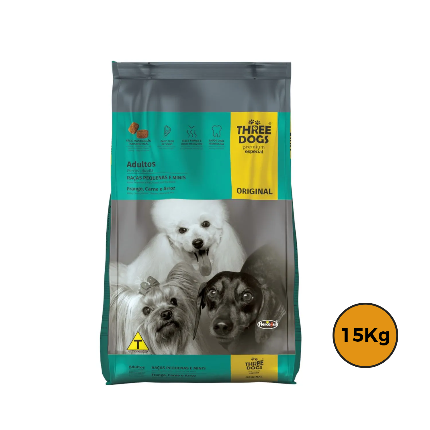 Three Dogs Premium Especial Original Adultos Razas Pequeñas y Minis es un alimento moderno y seguro, libre de colorantes y aromatizantes artificiales que presenta un óptimo costo beneficio. Su receta, rica en ingredientes de alta calidad, proporciona el equilibrio nutricional, palatabilidad superior y digestibilidad que los perros necesitan para tener una vida muy alegre y saludable. Ingredientes: Harina de carne y huesos bovina, harina de carne y huesos de cerdos, harina de subproductos de pollo, hidrolizado de hígado de pollo y cerdos, arroz quebrado, maíz integral molido, linaza, grasa animal estabilizada, salvado de trigo, cloruro sódico (sal común), cloruro potásico, cloruro de colina, hexametafosfato sódico, extracto de yucca, antioxidantes (BHA/BHT), vitaminas (A, B1, B2, B6, B12, D3, E, K3, niacina, ácido pantotênico, ácido fólico y biotina) y minerales (zinc orgânico, selenio orgánico, iodato de cálcio, selenito sódico, sulfato de cobre, sulfato de manganeso, sulfato de zinc, sulfato de hierro). Eventuales sustitutos: Sorgo y Trigo
